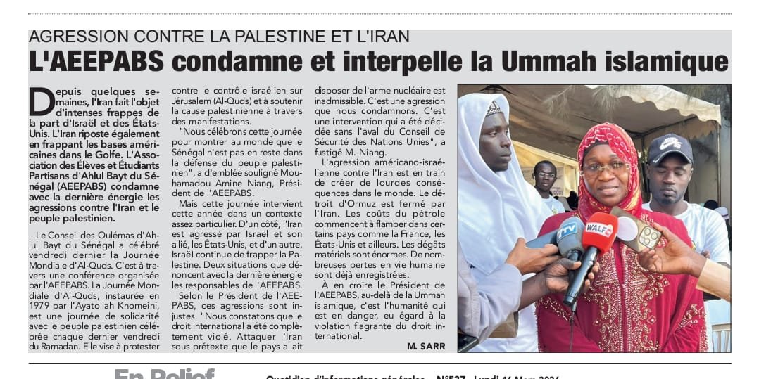 Actualité WalfQuotidien N°10185: CÉLÉBRATION | JOURNÉE MONDIALE AL QODS AU SÉNÉGAL Les Oulémas d’Alhubayat dénoncent les agressions contre la Palestine et l’Iran Conseil des Oulémas d'Ahl-Bayt as du Sénégal mars 16, 2026