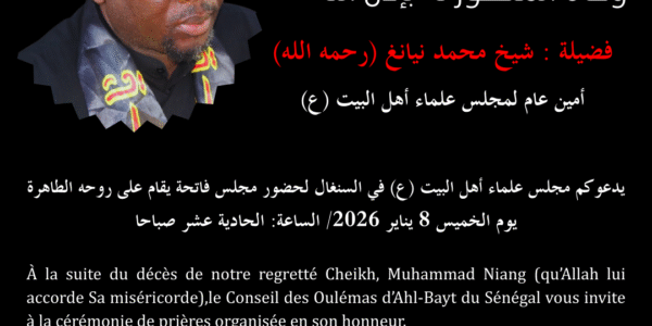 À la suite du décès de notre regretté Cheikh, Muhammad Niang (qu’Allah lui accorde Sa miséricorde), le Conseil des Oulémas d’Ahl-Bayt du Sénégal vous invite à la cérémonie de prières organisée en son honneur.